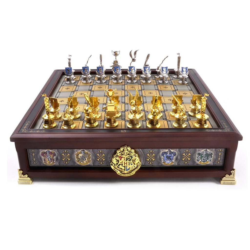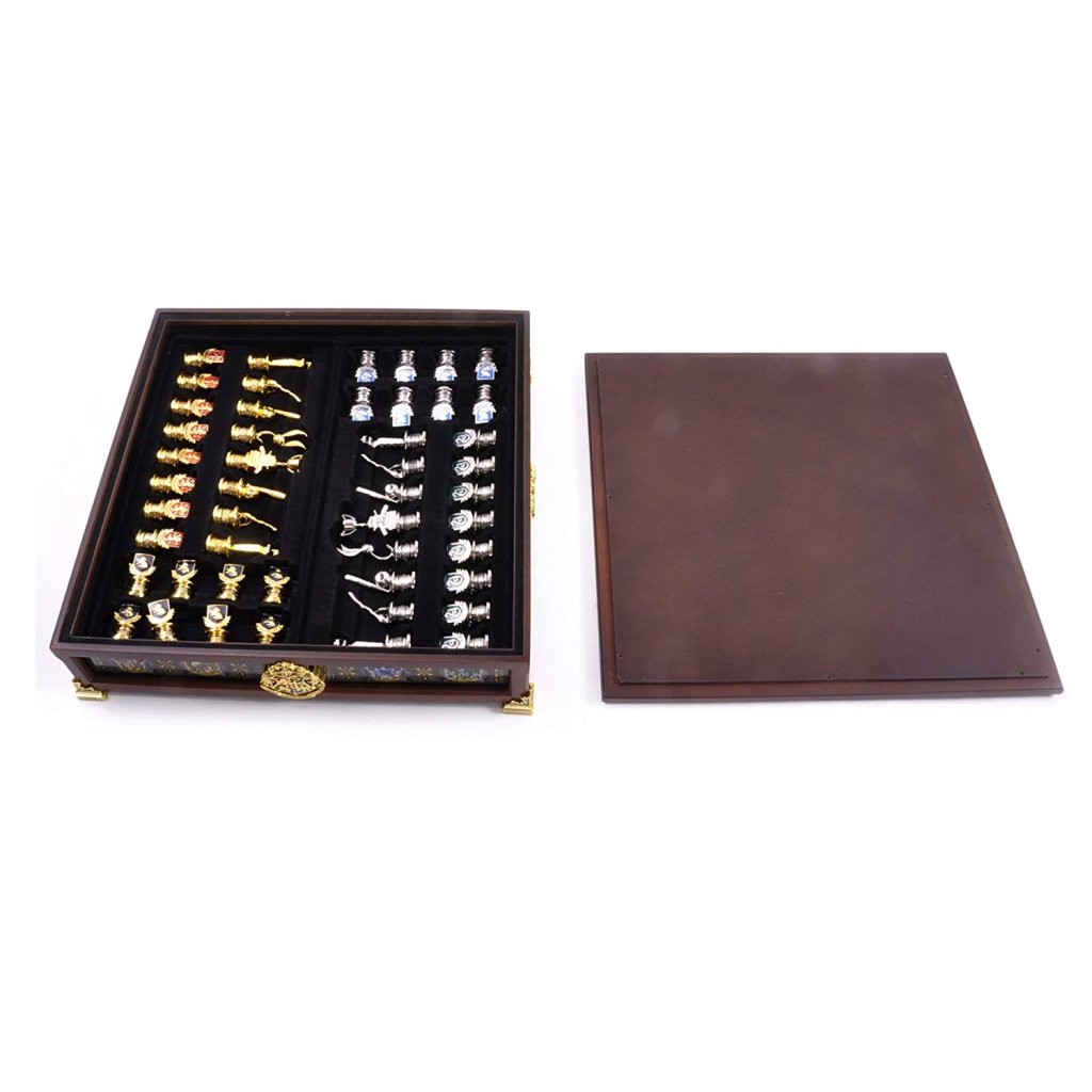 Exkluzívny šach v luxusnej edícii s pozlátenými ornamentmi na drevenom podstavci s kovovými figúrkami.
