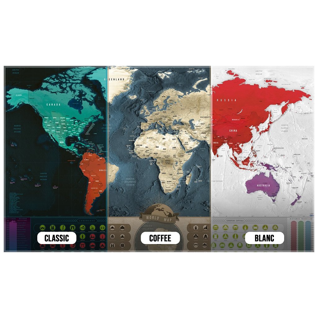 Kvalitná stieracia vrstva dodáva luxusný dojem a je ľahko stierateľná. Po zotretí odhalí farebnú mapu sveta a zaznamená, ktoré miesta ste už navštívili. Vyberte si svoj štýl.